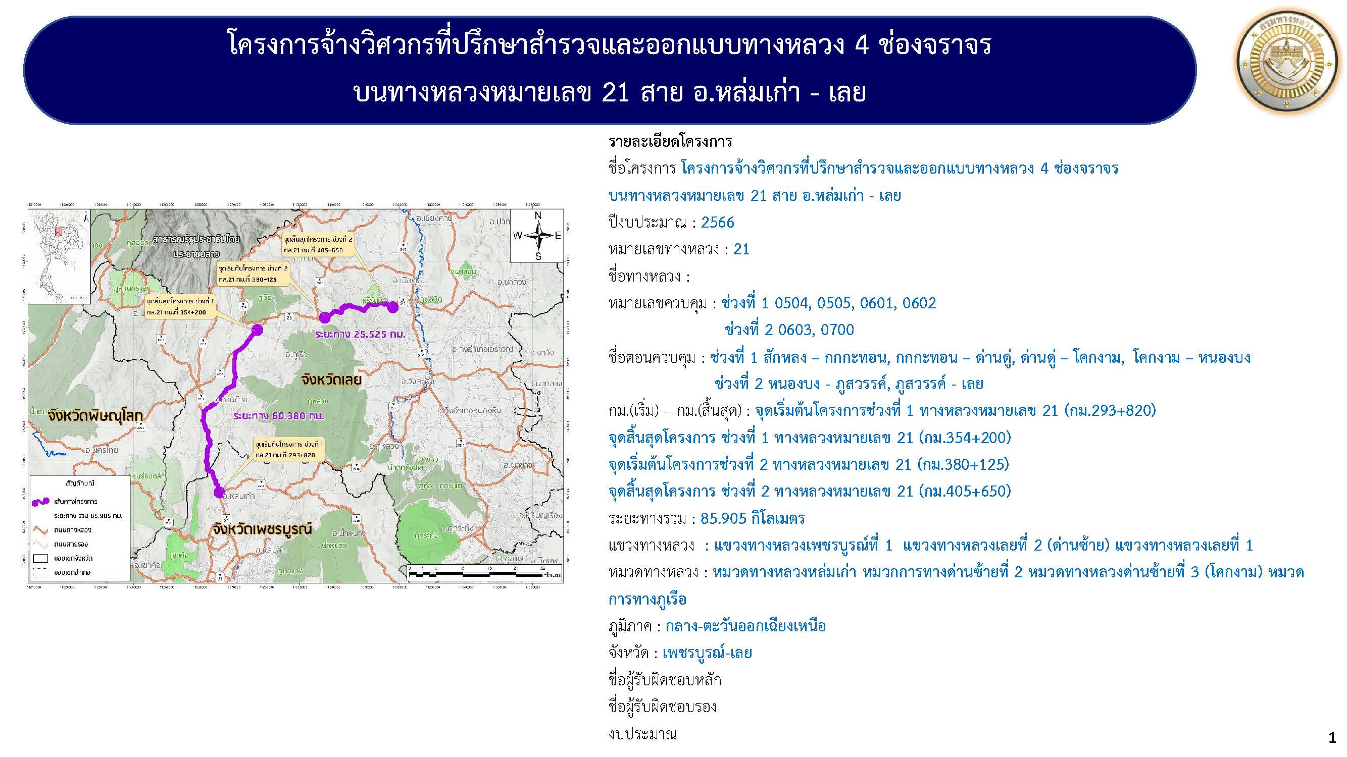 โครงการจ้างวิศวกรที่ปรึกษาสำรวจและออกแบบทางหลวง ๔ ช่องจราจรบนทางหลวงหมายเลข 21 สาย อ.หล่มเก่า - เลย